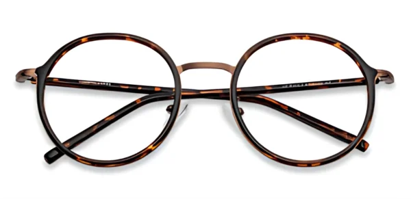 Classic round tortoiseshell eyeglass frame with metal temples – lightweight, stylish, and perfect for everyday wear.